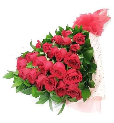 Contiene 24 rosas rojas y rusco, papeles decorativos y moño. Incluye tarjeta personalizada. Detalle ideal para regalar en un Aniversario. Puedes seleccionar el color de rosas que desee, adicionar chocolates, globos o peluches.