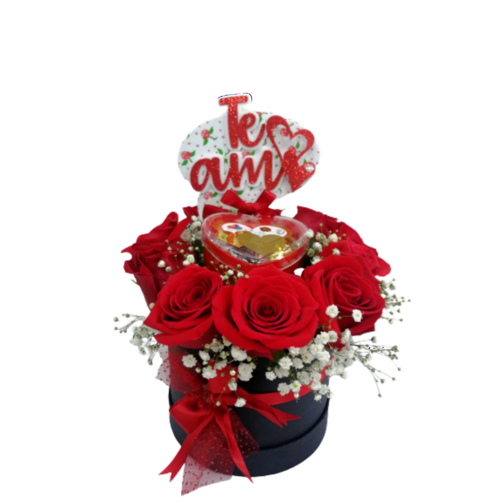 Detalle floral en caja redonda de cartón rígido con 10 botones de rosa y gypsophila. En el centro contiene una caja de chocolates corazón pequeña. Contiene palin decorativo en foamy según la ocasión.
