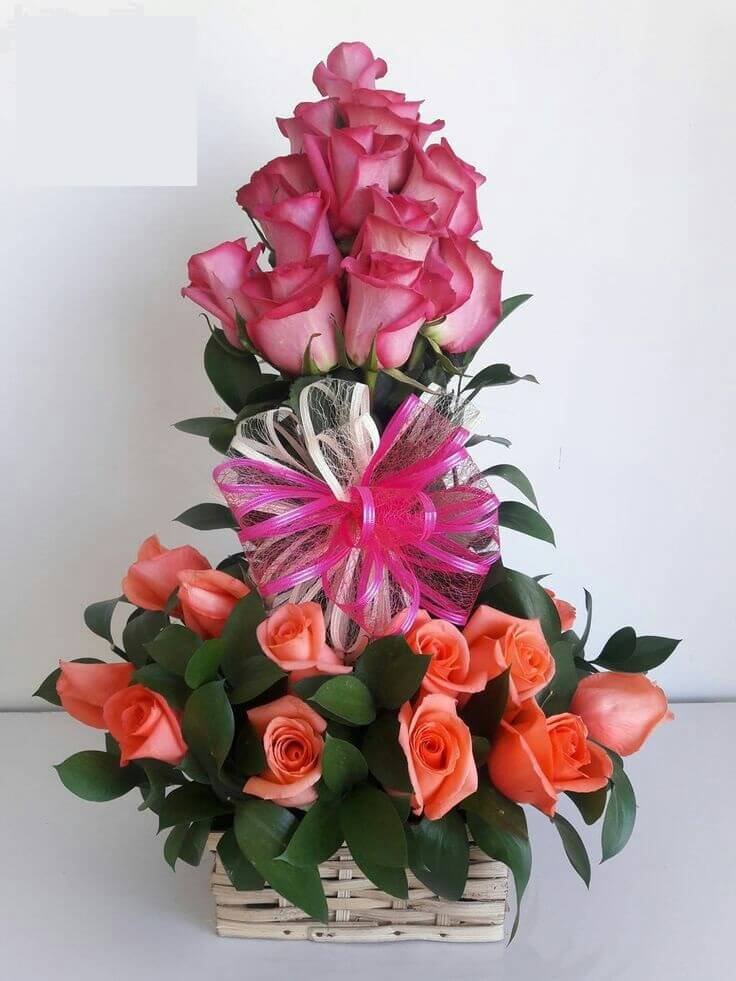 Arreglo floral de 24 rosa aproximadamente decorado von follajes verdes y un hermoso moño.