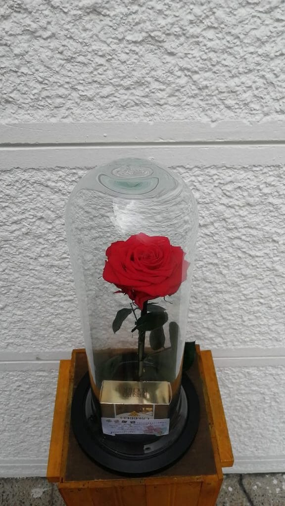 Rosa preservada en cúpula de vidrio, con duración de hasta un año.